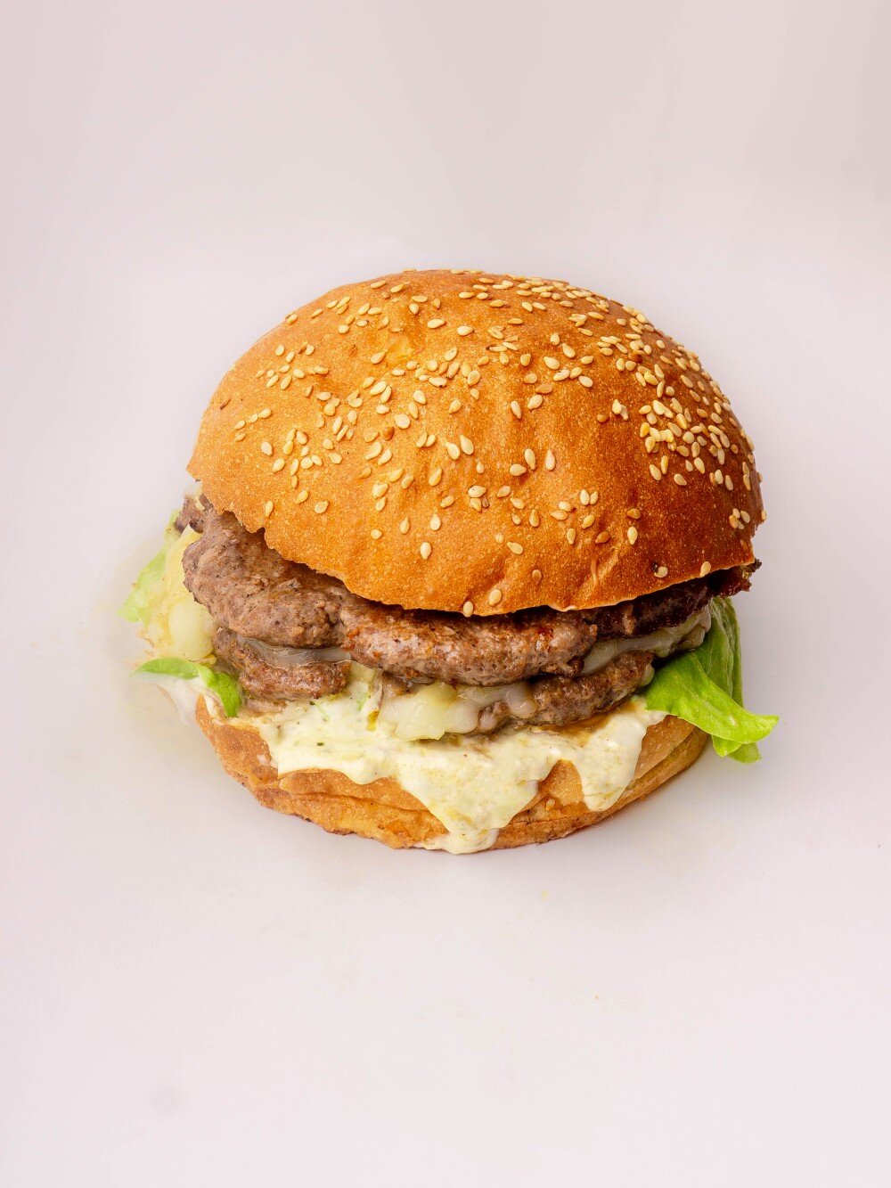 Фирменная булочка, котлета говяжья халал 2 шт., пекинская капуста, корнишоны, красный лук, яйцо, перчик халапеньо, сыр Моцарелла, соус Барбекю, соус фирменный “Алаш”