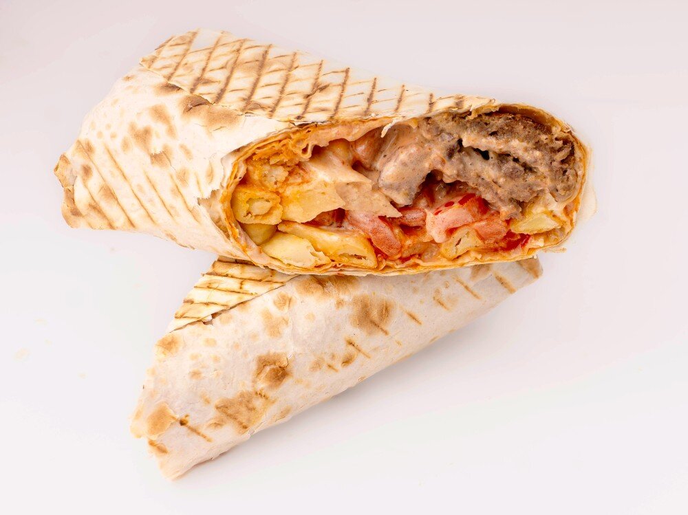 Лаваш, котлета говяжья халал 2 шт., помидоры, корнишоны, фирменный соус, картофельные дольки, сыр моцарелла