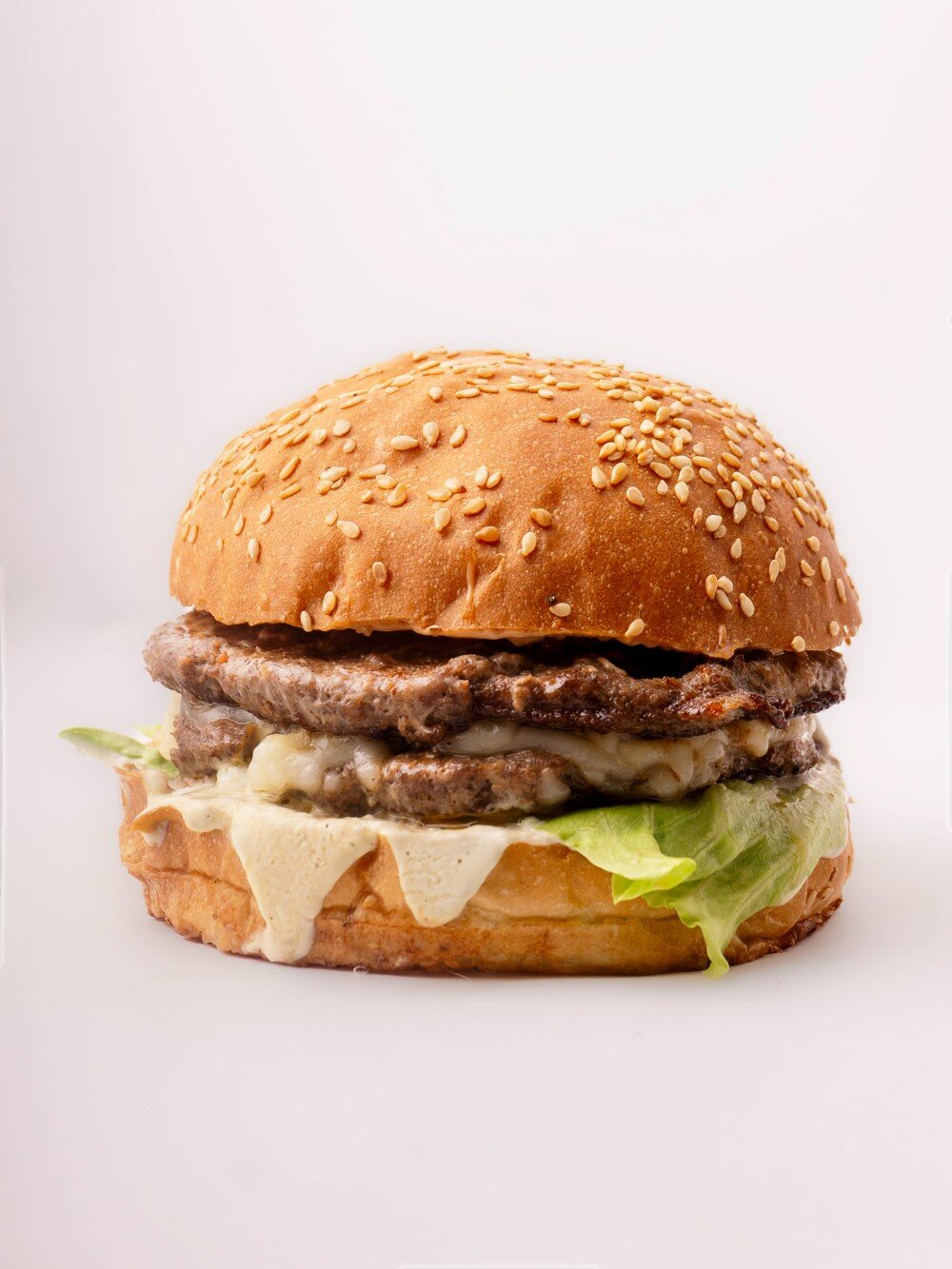Фирменная булочка, котлета говяжья халал 2 шт., пекинская капуста, корнишоны, красный лук, сыр Моцарелла, соус фирменный “Алаш”