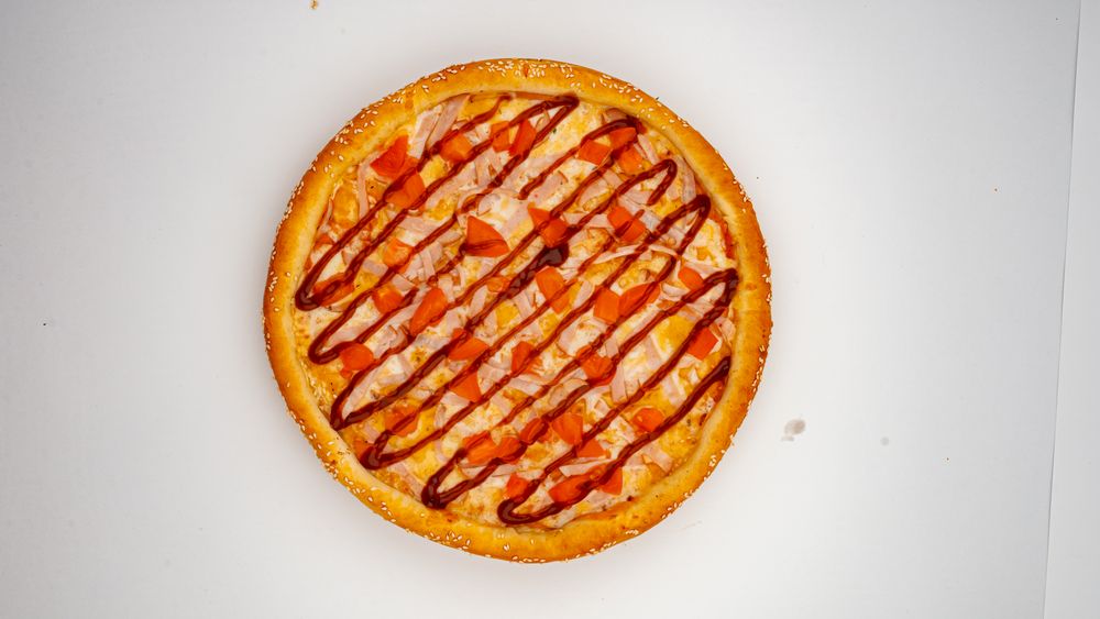 Сырный бортик, фирменный соус, помидоры, куриный рулет, барбекю соус, сыр «Моцарелла», орегано Ірімшік жиегі, фирмалық тұздық, қызанақ, тауық орамы халал, барбекю тұздығы, Моцарелла ірімшігі, орегано