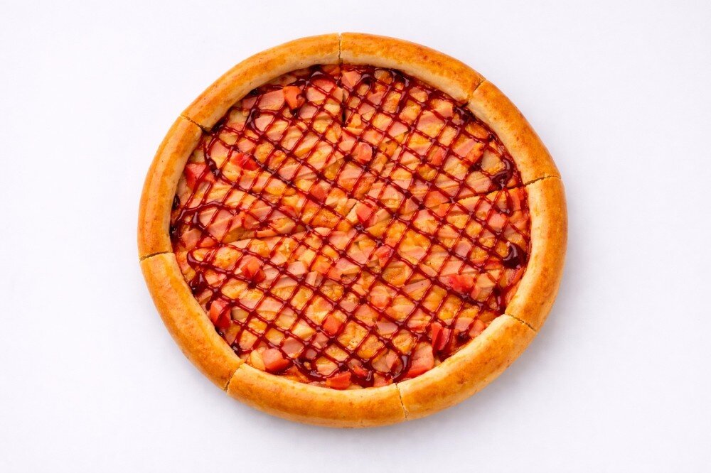 Фирменный соус, помидоры, куриный рулет, барбекю соус, сыр «Моцарелла», орегано фирмалық тұздық, қызанақ, тауық орамы халал, барбекю тұздығы, Моцарелла ірімшігі, орегано